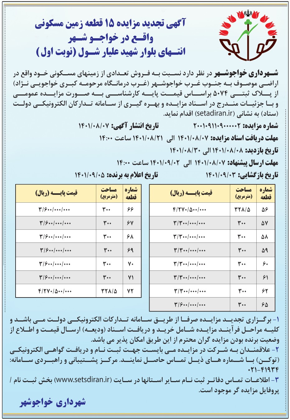 آگهی تجدید مزایده 15 قطعه زمین مسکونی در خواجوشهر انتهای بلوار شهید علیار شول (نوبت اول)
