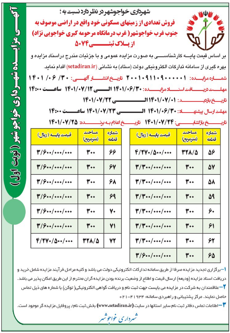 آگهی مزایده فروش تعدادی از زمین های مسکونی واقع در اراضی موصوف به جنوب غرب خواجوشهر (غرب درمانگاه مرحومه کبری خواجویی نژاد)